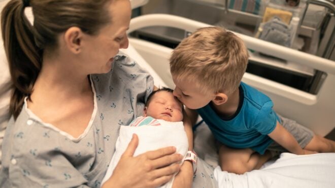 pregnant woman with toddler hugging baby bump